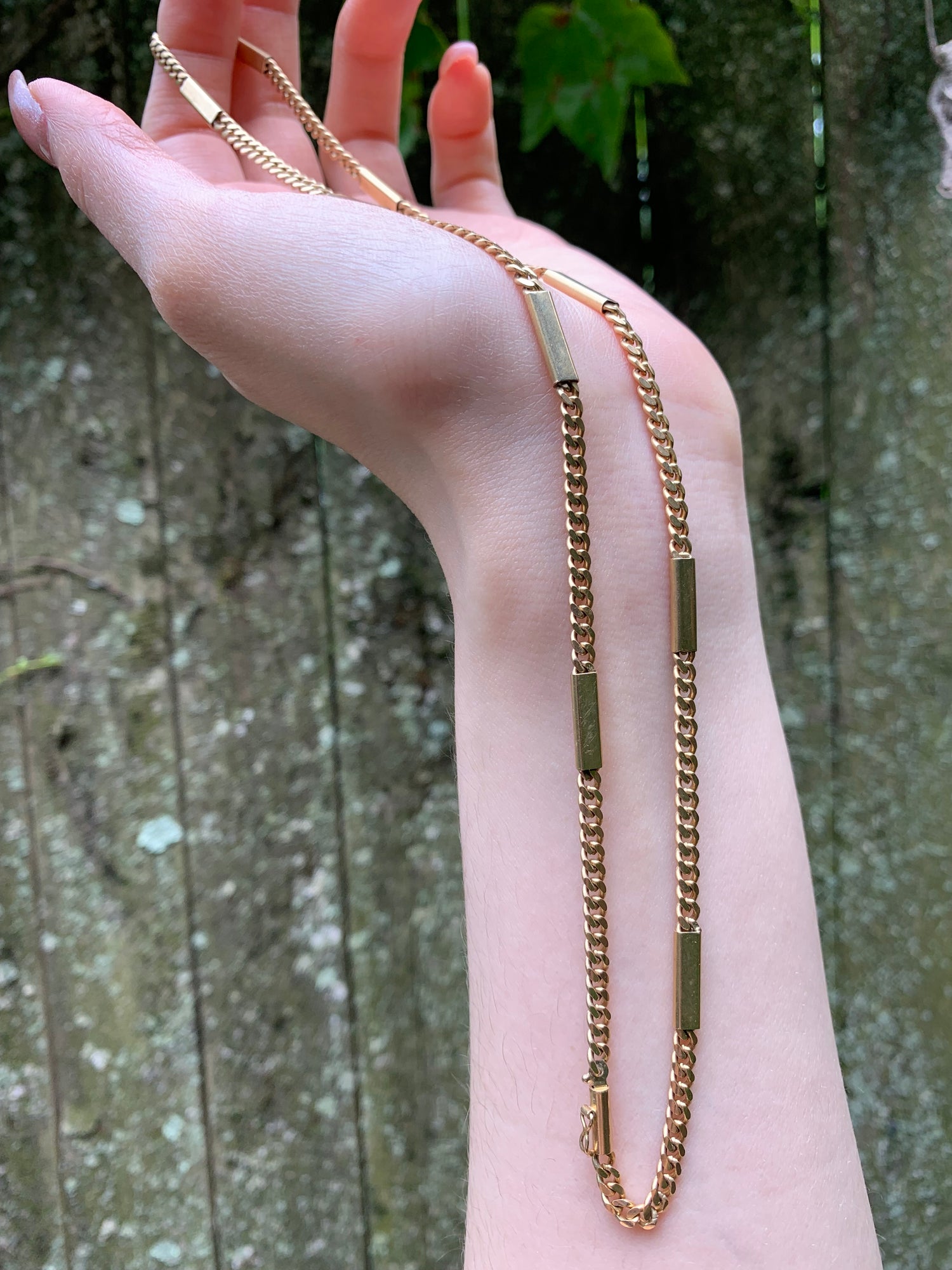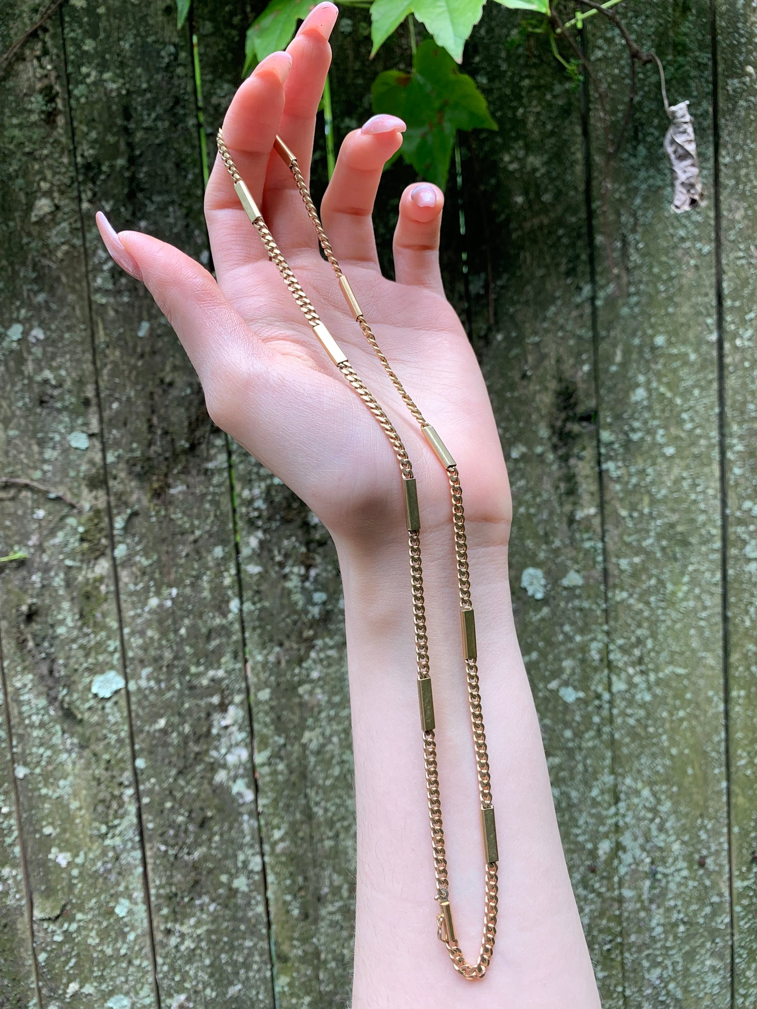 This modern chain has curb links and flat, polished stations in regular increments along its length. A beautiful halo of gold to wear by itself, layered with other chains, and it also has a small enough clasp to run it through a pendant bale. The perfect piece to add a gleam to all of your ensembles!