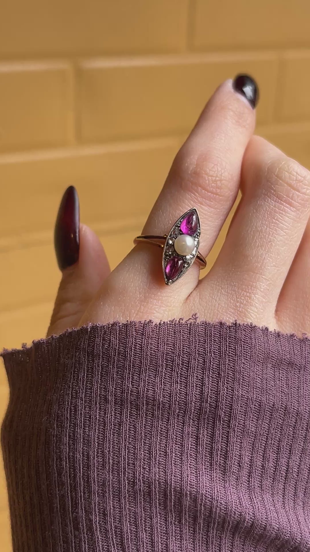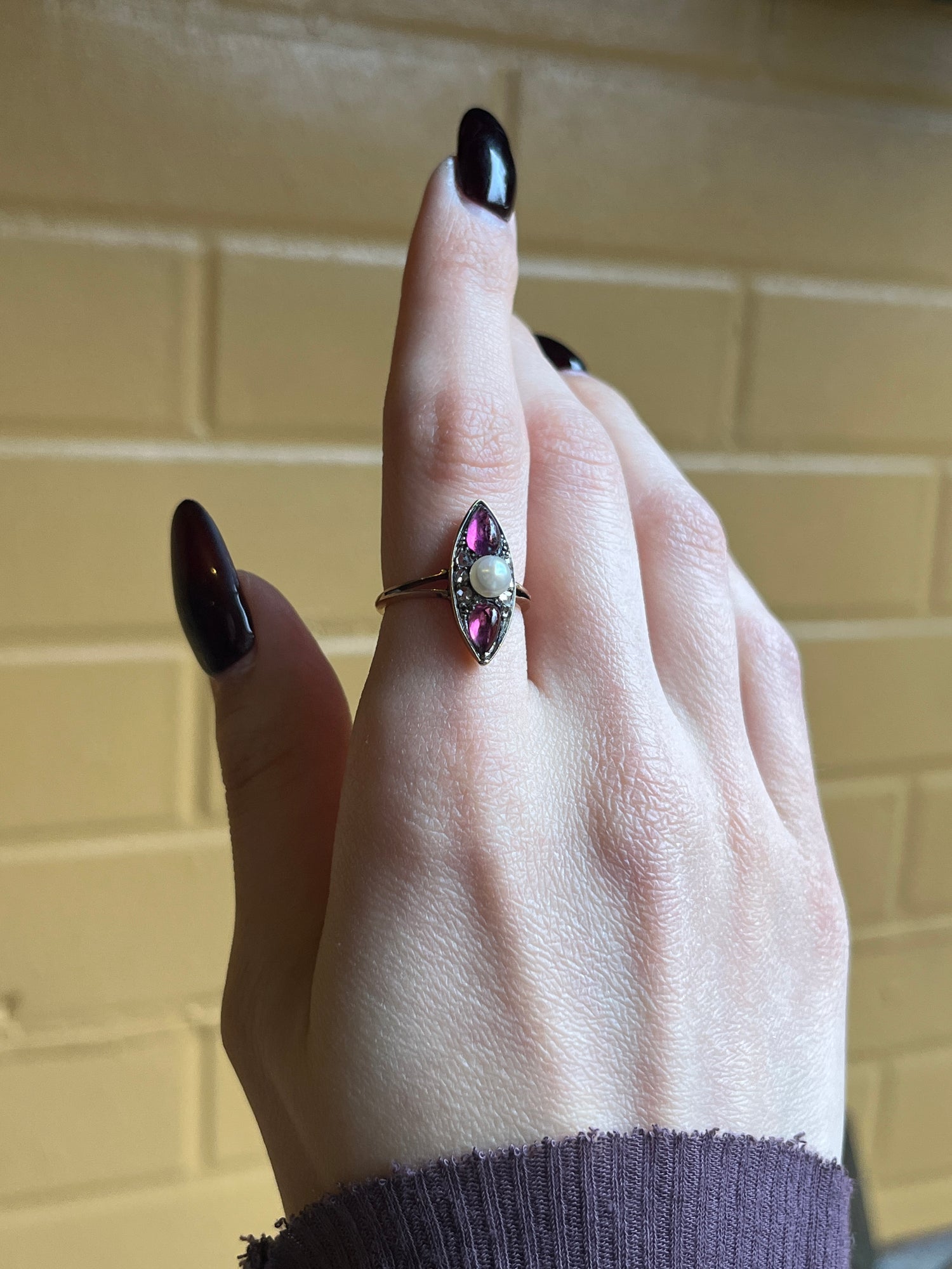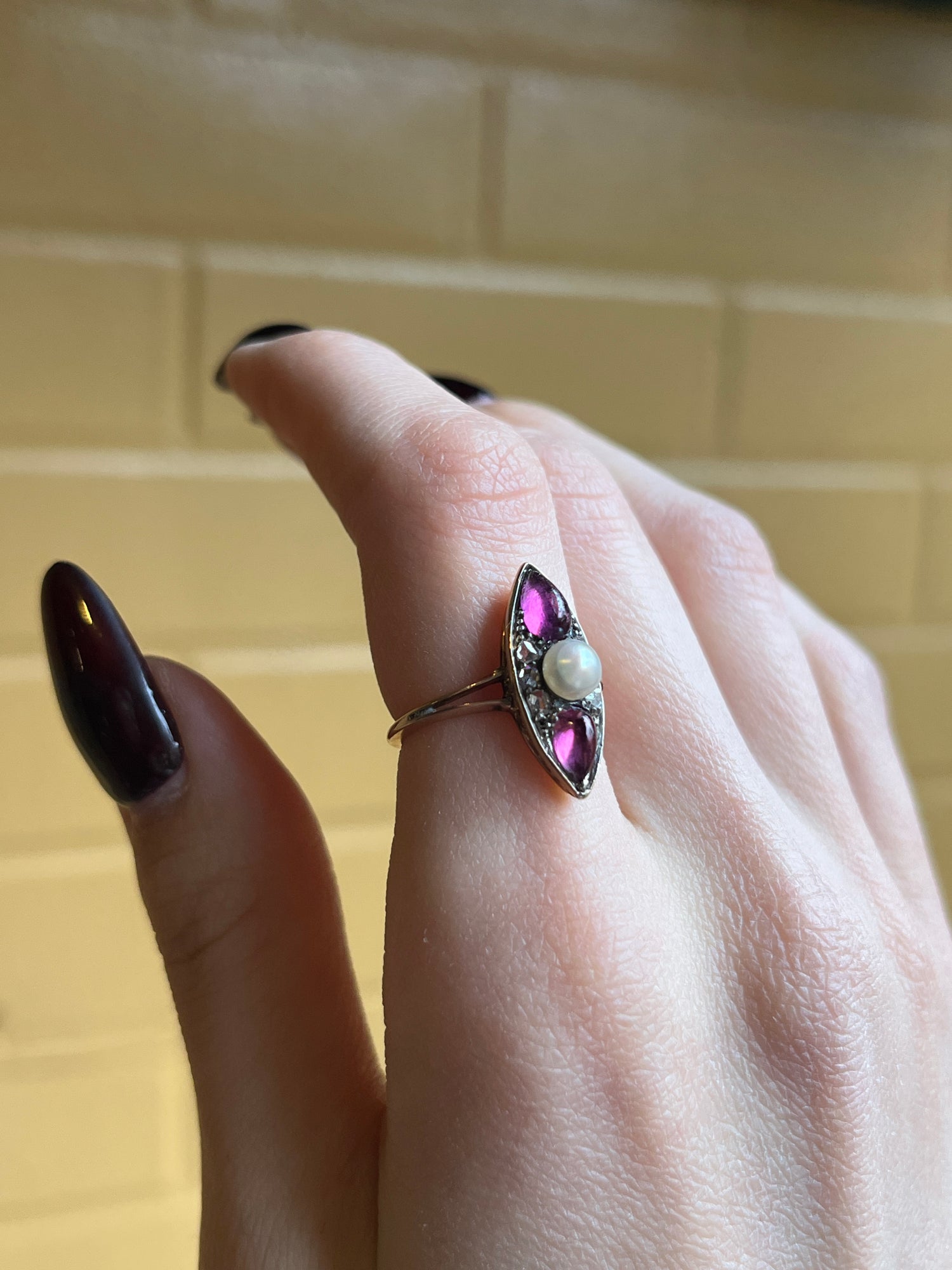 Antique French 18K, Diamond, Amethyst & Pearl Navette Ring