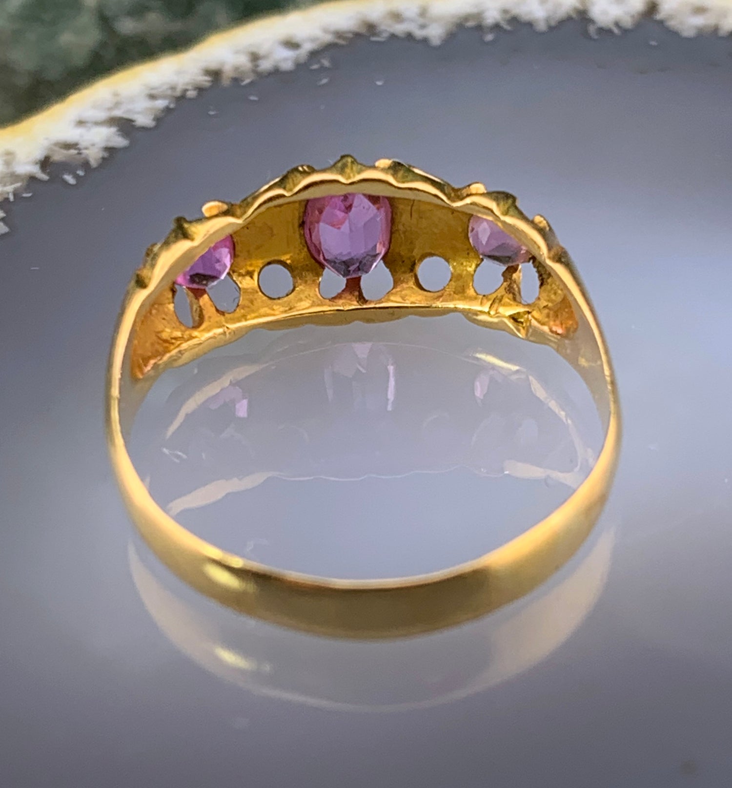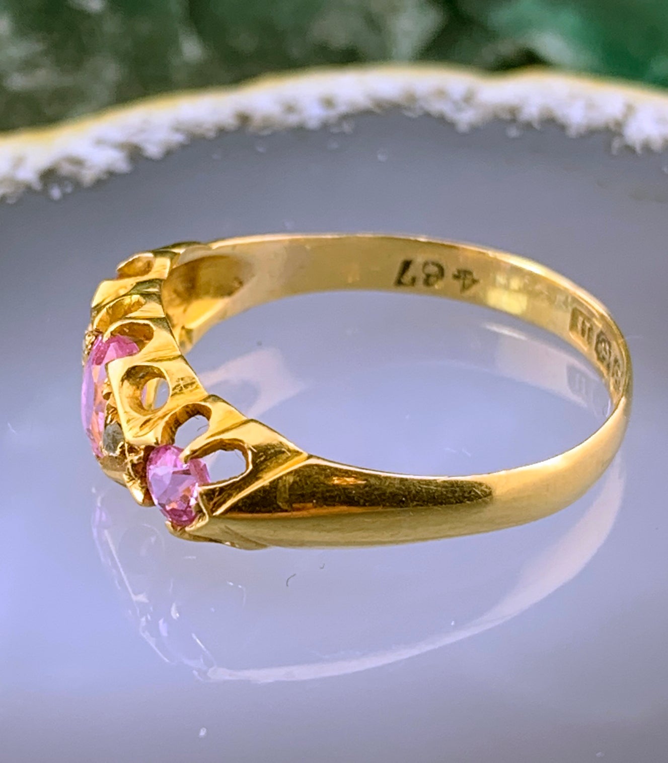 Three bright, perfectly pink tourmaline stones stand at attention on the face of this early 20th century ring. Crafted in 18 karat yellow gold and accented with diamonds, it is a typical design of the time. The low profile makes it easy to wear and fit comfortably under a glove, and a dream to stack! A little beauty, with ample hallmarks dating it to 1912, it will hold a very special place in your collection!