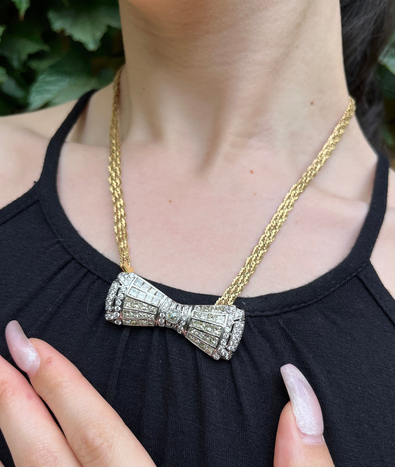 The bow motif has been a popular and desirable look all through the history of jewelry. For centuries famous makers and jewelry houses have featured bows in nearly all of their pieces, with stylistic elements that reflect the times and social settings of each era. During the 18th century in the French court of Louis XIV, bow brooches were used as “ribbon language” to communicate one’s availability for matrimony. Typically they were diamond bow brooches called Sévignés, named after the Marquise de Sévigné whose famous French writings spoke of ladies with strategically placed bow brooches and necklaces. A bow worn over the heart indicated the woman was taken and had found true love, a bow dangling around the neck indicated that she was in between loves, and a bow over the décolletage was an invitation for new love suitors.