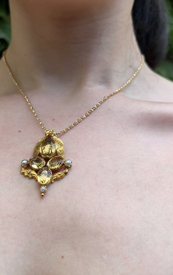 Set in 15 karat yellow gold, this intriguing pendant could have begun as an element to a larger piece. Expertly crafted with a botanical motif in the Archeological Revival style, it has glorious, vibrant citrine stones and is accented with seed pearls. A hook on the back could be utilized to wear on a chain or ribbon. A beautiful, sunny piece sure to become a favorite in your collection!
