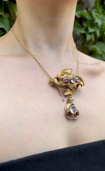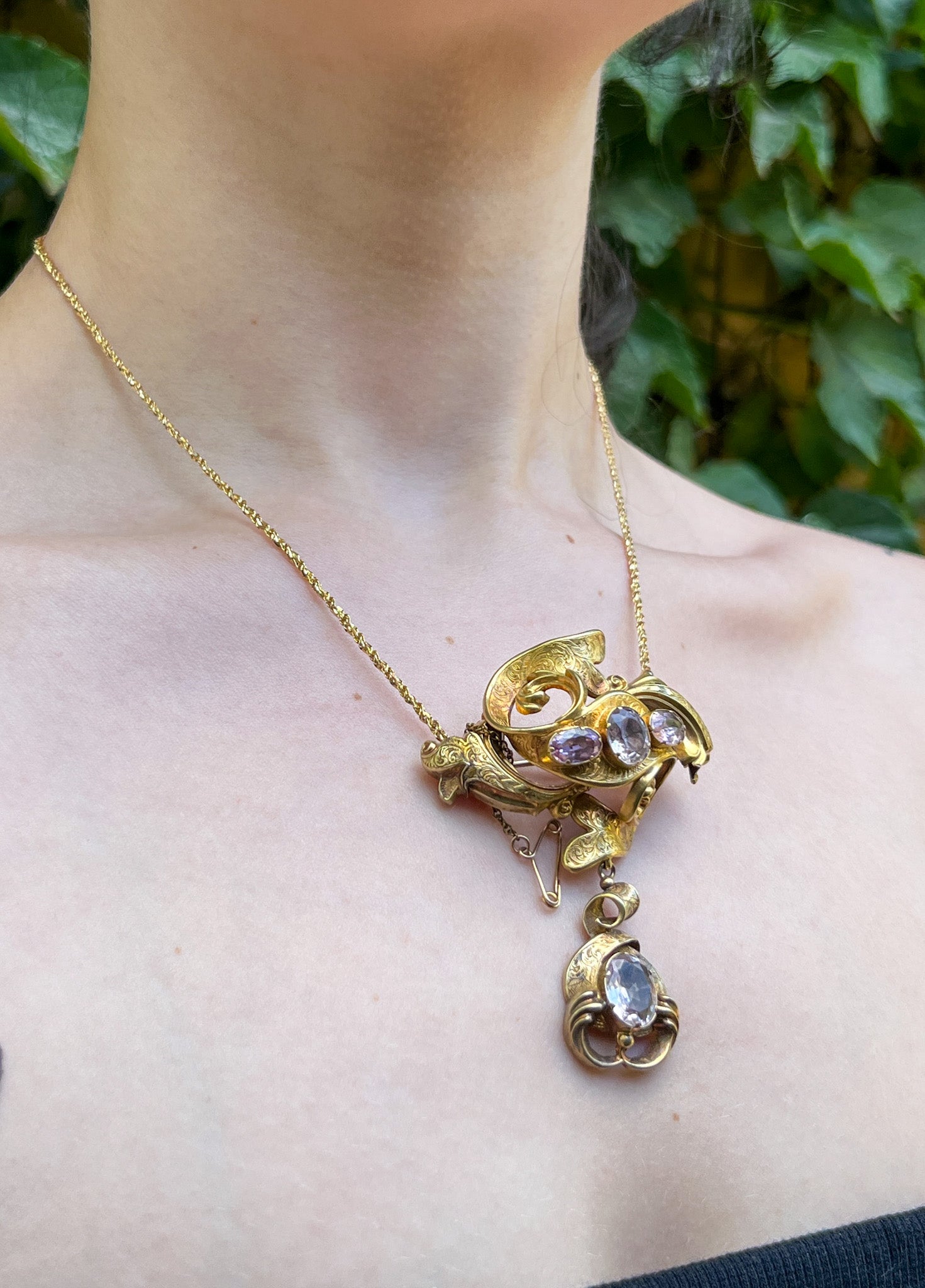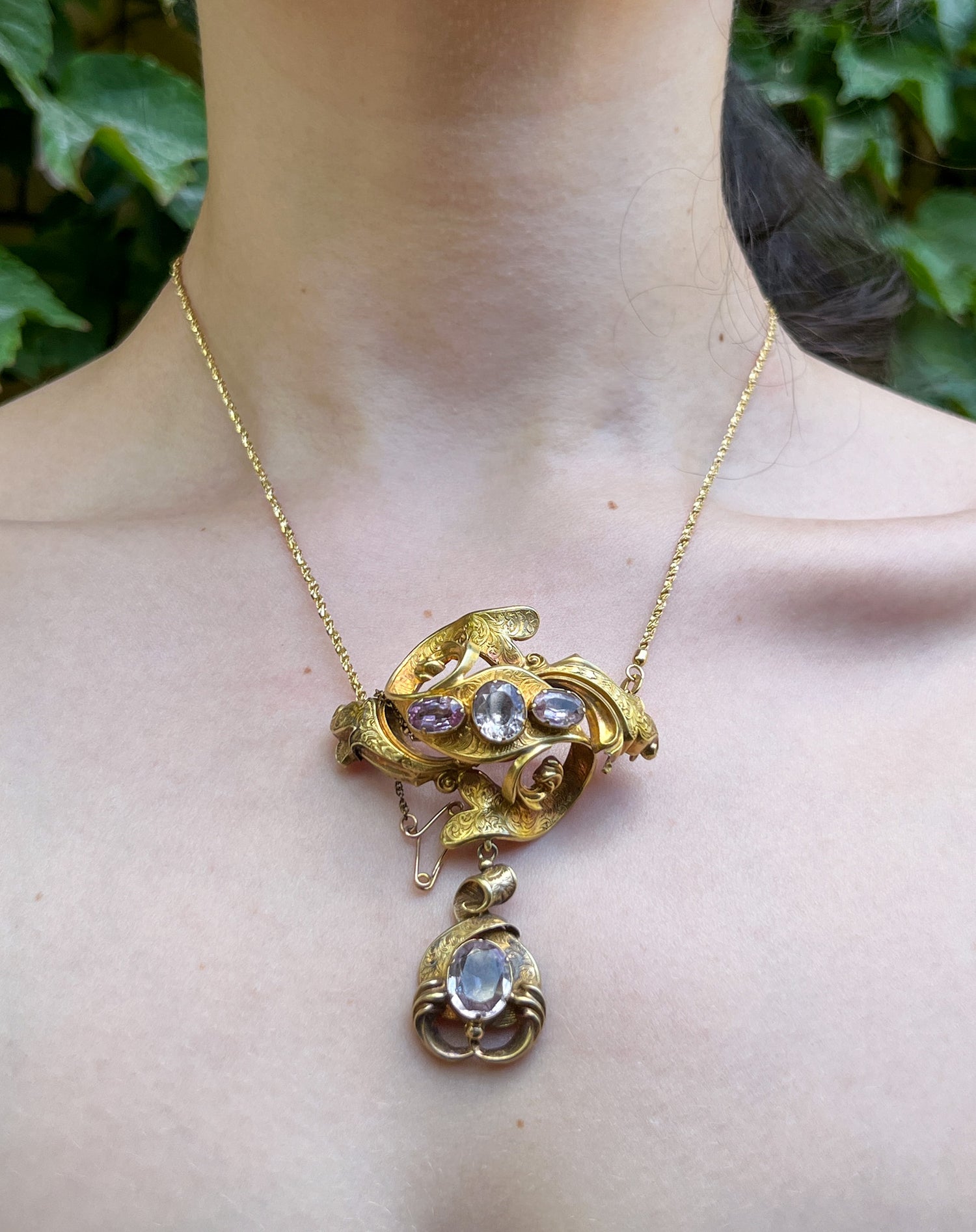 Crafted in 15 karat yellow gold, this stunner has a stylized knot with gorgeous chase work and foiled pink topaz stones. In true Victorian fashion, the back has a locket with woven hairwork under glass. Wonderful on your lapel or pinned to a velvet ribbon and worn as a choker, it is a timeless piece you'll treasure forever!