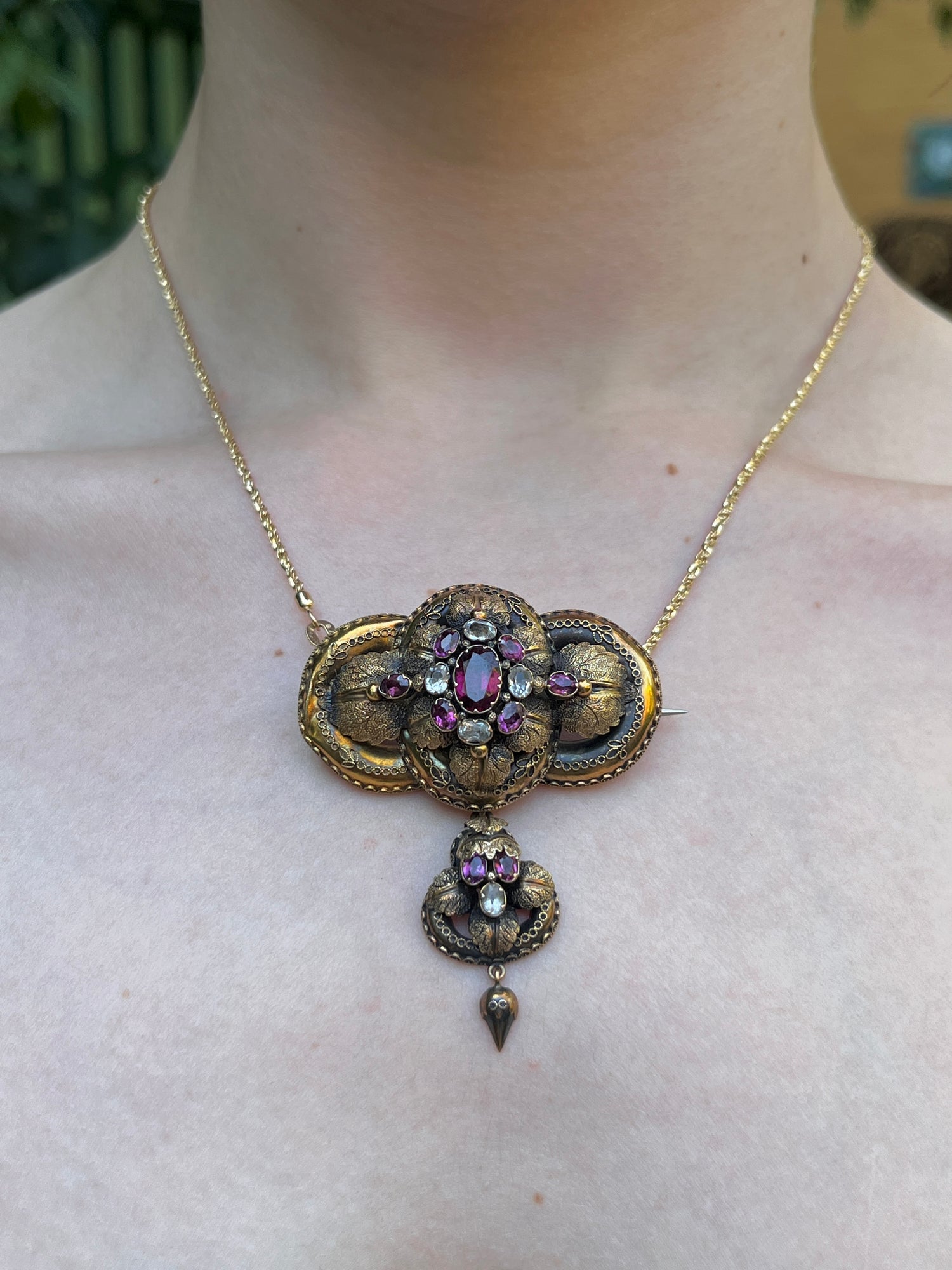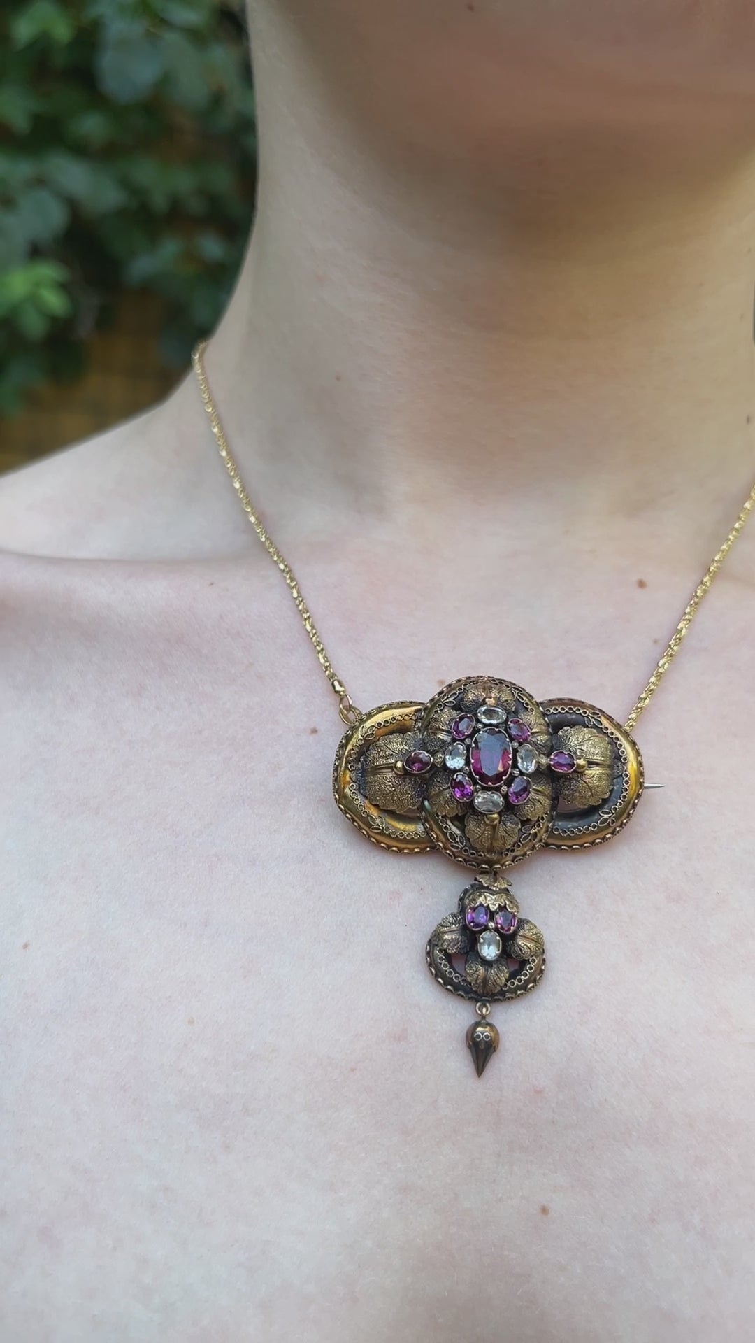 Crafted in 14 karat yellow gold, this beauty has a stylized knot with gorgeous granulation work with a botanical motif. Glittering foiled pink tourmaline and chrysoprase stones sparkle and shine in the light! Wonderful on your lapel or pinned to a velvet ribbon and worn as a choker, it is a timeless piece you'll treasure forever!